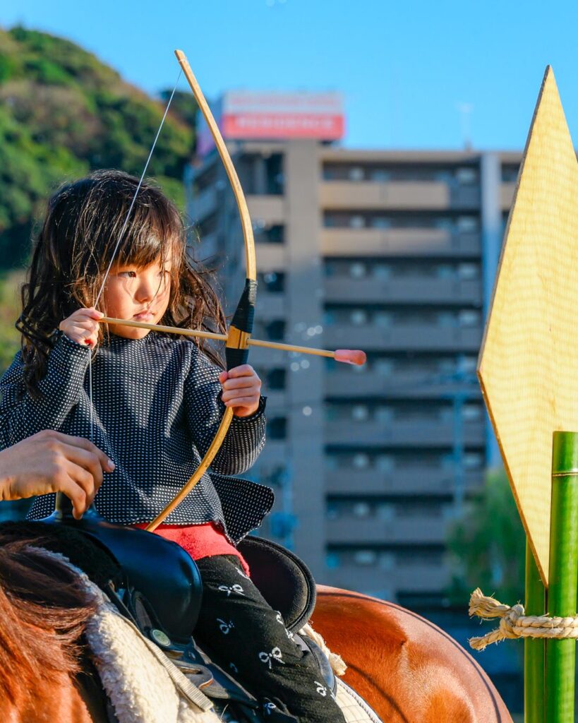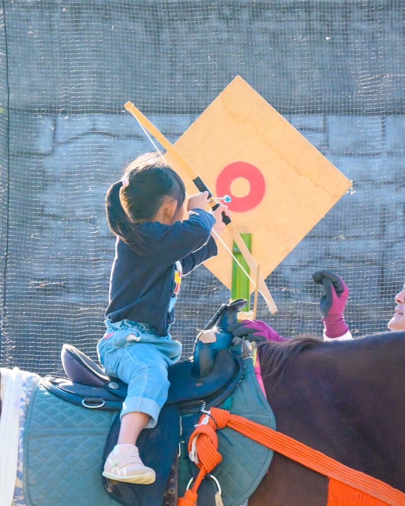 馬に乗って、ミニ弓矢を射る