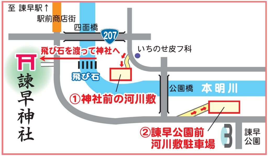 徒歩1分の「神社前の河川敷」⇒ 出入口:いちのせ皮フ科前